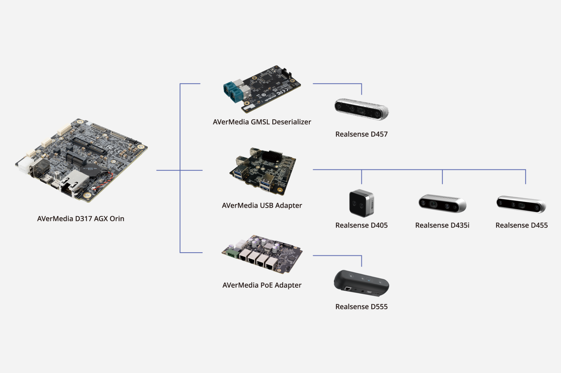 Each configuration runs on the same AVerMedia NVIDIA® Jetson™ AGX Orin D317 carrier board, delivering consistent performance and seamless interoperability.